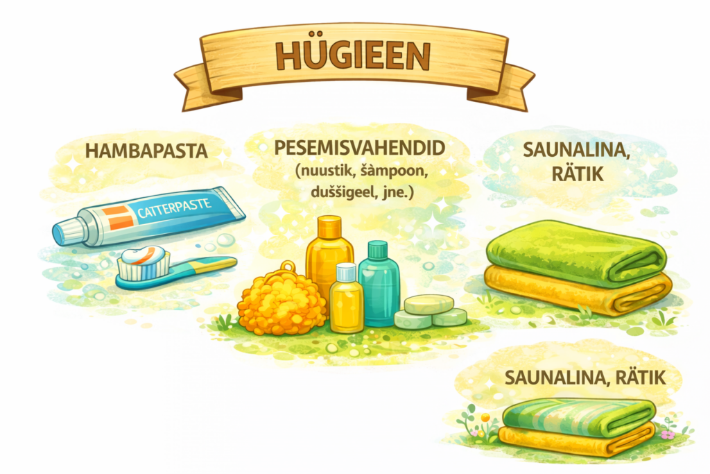 • Pesemisvahendid (Nuustik, šampoon duššigeel, jne.)